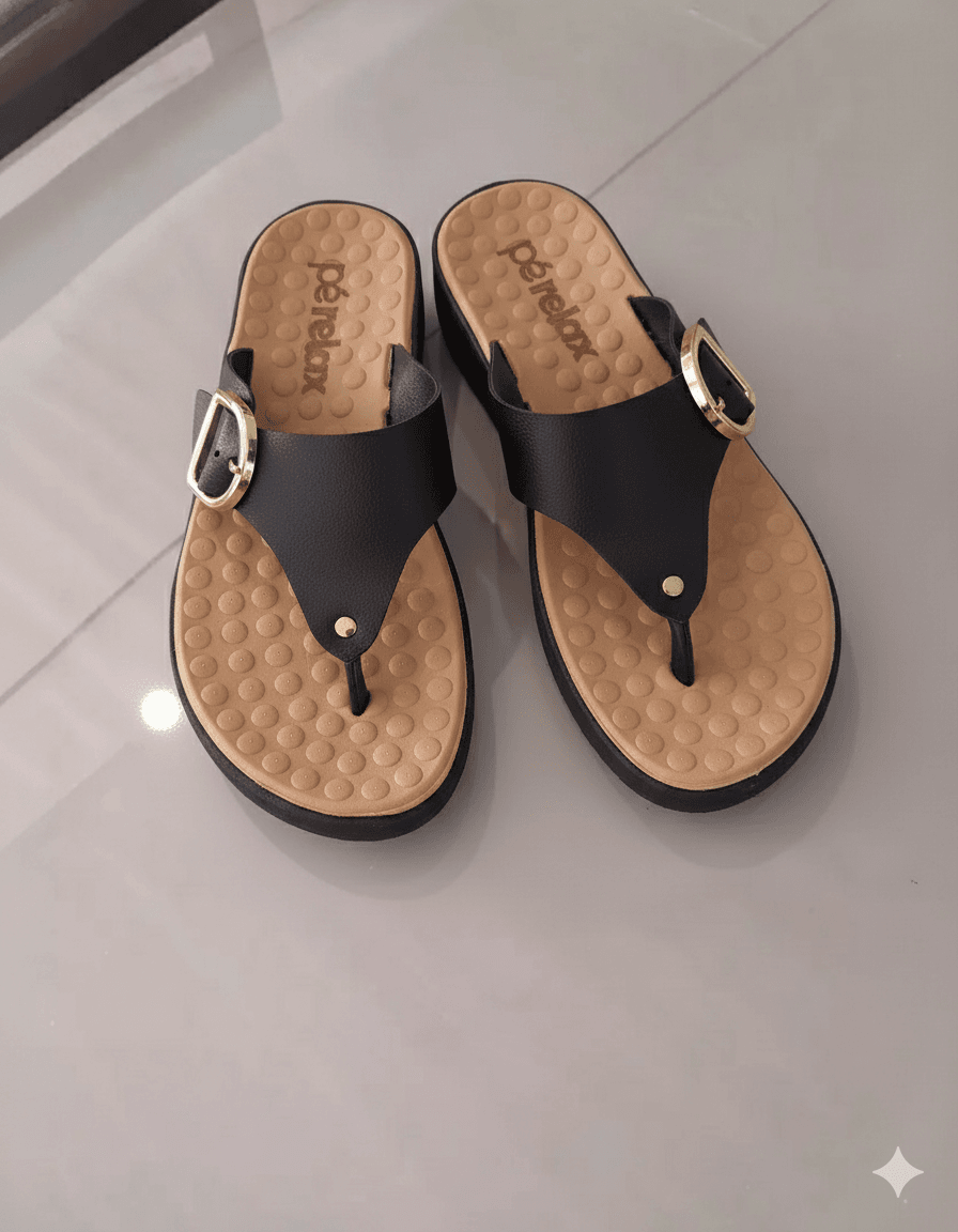 A palmilha anatômica conta com esferas massageadoras que ajudam a ativar a circulação e reduzir a tensão, proporcionando uma sensação de leveza imediata. O solado superaderente garante firmeza a cada passo, enquanto o salto anatômico baixo distribui o peso do corpo de forma equilibrada, contribuindo para o alinhamento postural.
