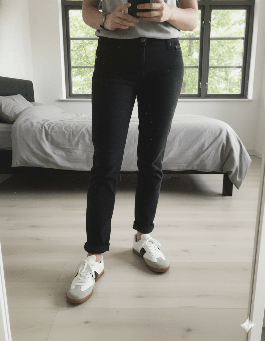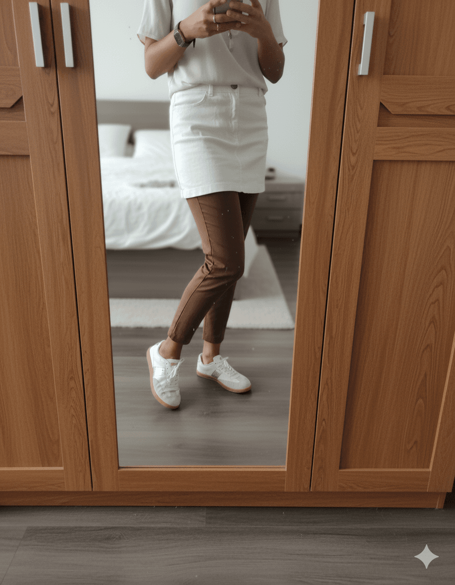 Jeans reto, calça de alfaiataria cropped, saia midi, vestido t-shirt, jaqueta bomber ou blazer leve — vai do casual ao arrumado sem esforço.